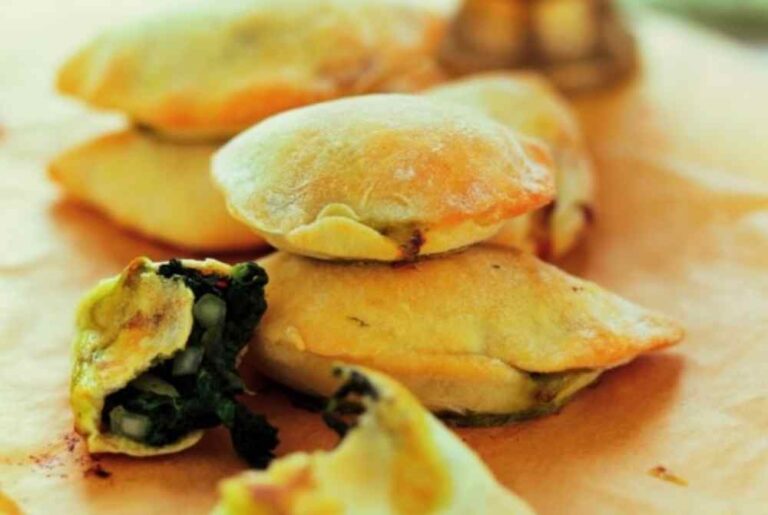 - Ανακατεύετε τα χόρτα με όλα τα υπόλοιπα υλικά, εκτός από τον κρόκο. Ανοίγετε τη ζύμη σε φύλλο πάχους 0,5 εκ. πάνω σε αλευρωμένη επιφάνεια. Κόβετε δισκάκια με διάμετρο 10 εκ. Βάζετε 1 γεμάτη κουταλιά από τη γέμιση στο κέντρο κάθε φύλλου και τα διπλώνετε σα μισοφέγγαρα. Πατάτε με τα δάχτυλά σας για να κολλήσουν οι άκρες.