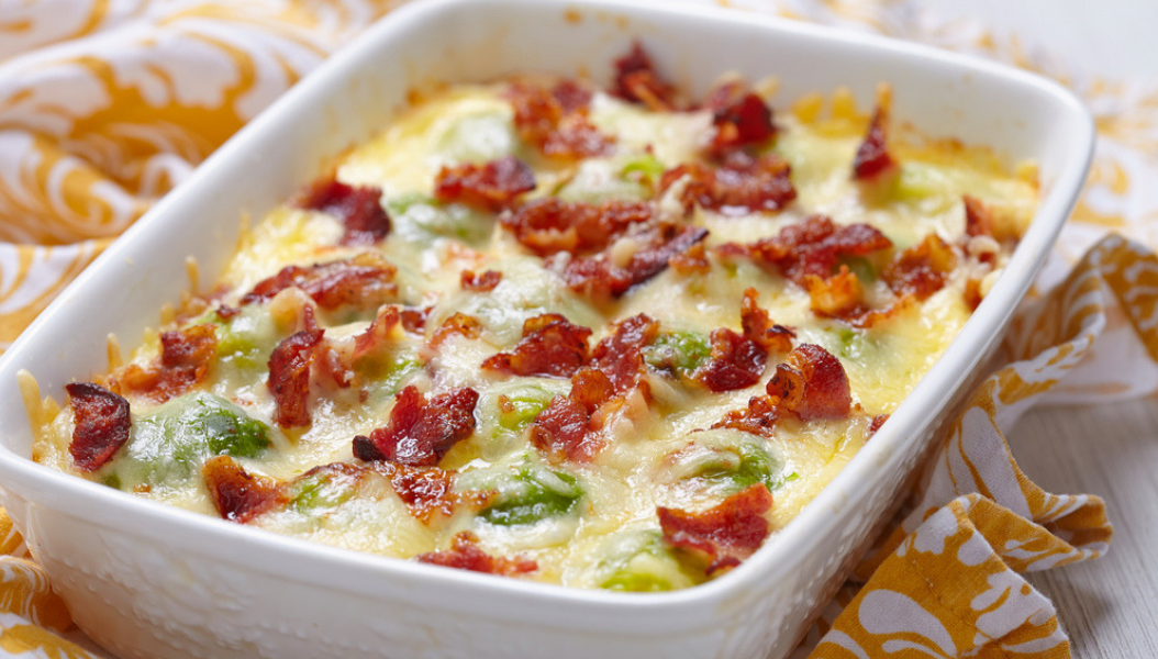 Συνταγή για λαχανάκια Βρυξελλών με τυριά και μπέικον, που γαρνίρουν κρέας και πουλερικά.