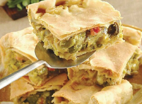 - Απλώνετε ομοιόμορφα τη γέμιση. Σκεπάζετε με τα υπόλοιπα φύλλα (λαδώνοντας και πάλι καλά το καθένα) και τυλίγετε τις άκρες της ζύμης που περισσεύει γύρω γύρω, στρίβοντάς τες ελαφρά. Χαράσσετε την επιφάνεια της πίτας σε τετράγωνα κομμάτια και αλείφετε και το τελευταίο φύλλο με ελαιόλαδο.