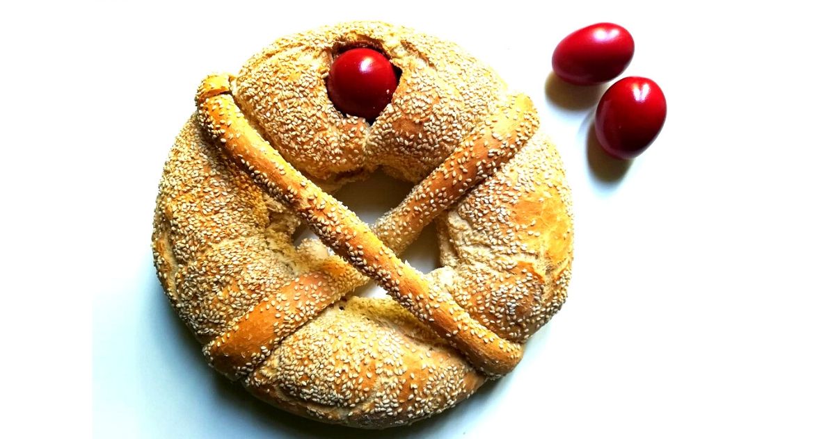 - Τοποθετείτε το λαμπρόψωμο σε ένα ταψί στρωμένο με αντικολλητικό χαρτί και το αφήνετε να φουσκώσει άλλα 30'. Περνάτε την επιφάνει με το ζχαρονερο και ασπαλίζετε με άφθονο σουσάμι. Αν θέλετε διακοσμείτε με κόκκινο αυγό. Το ψήνετε σε προθερμασμένο φούρνο 45΄στους 200° C μέχρι να αποκτήσει ωραίο χρώμα.