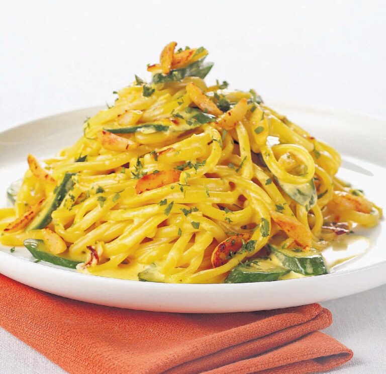 Ντελικάτη αυτή η λινγκουινάδα, με το χαρακτηριστικό άρωμα του κρόκου και τη γλύκα από τα κολοκυθάκια. Ταιριάζει με απαλά, ήπια λευκά κρασιά με βάση τη Ντεμπίνα, για ένα δροσερό αποτέλεσμα, κι ακόμα περισσότερο αν πρόκειται για την αφρώδη εκδοχή της ποικιλίας. Από την άλλη, ένα ζουμερό χαρμάνι με λευκό Μοσχάτο και άλλες λευκές ποικιλίες, θα αναδείξει το λεπτό χαρακτήρα αυτού του πιάτου.