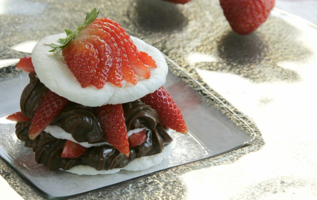 - Σε ένα πιάτο τοποθετείτε ένα δισκάκι μαρέγκα, βάζετε λίγη μους σοκολάτα με το κορνέ και φρέσκες φράουλες Συνεχίζετε με ένα ακόμα δισκάκι μαρέγκα, μους σοκολάτα και φράουλες με τον ίδιο τρόπο και καλύπτετε με μια ακόμα μαρέγκα. Το μιλφέιγ είναι έτοιμο και το στολίζετε με μισή φράουλα μαζί με το κοτσάνι της στην κορυφή.