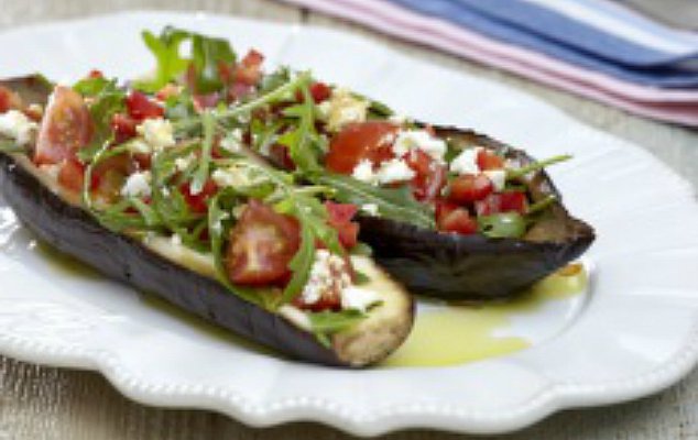 - Σε ένα μπολ ρίχνουμε τις πιπεριές, τη ρόκα, τα ντοματίνια, την τριμμένη φέτα, το ελαιόλαδο, το θυμάρι και τη ρίγανη, το πιπέρι και το ανάλογο αλάτι και τα ανακατεύουμε ελαφρά. Γεμίζουμε τις ψημένες μελιτζάνες με το μίγμα, ρίχνουμε λίγο ξίδι και σερβίρουμε.