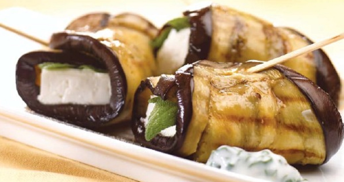 - Τοποθετείτε τις ψημένες μελιτζάνες σε επίπεδη επιφάνεια και βάζετε στο κέντρο κάθε φέτας ένα κομμάτι κατσικίσιο τυρί. Τυλίγετε τις μελιτζάνες σε ρολά και τις καρφώνετε με οδοντογλυφίδες.