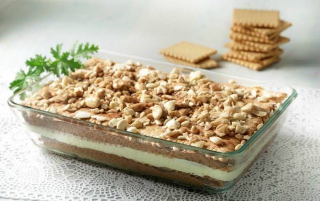 - Επαναλαμβάνετε με μία στρώση μπισκότα, τα περιχύνετε με καφέ και απλώνετε την κρέμα ζαχαροπλαστικής. Κατόπιν πάλι μπισκότα και σοκολατένια κρέμα και τελειώνετε με μπισκότα. Πασπαλίζετε τα πλαϊνά του γλυκού με αμύγδαλα χοντροκομμένα και την επιφάνεια με κακάο και σπασμένα μπισκότα. Σερβίρετε ωραίο, κρύο απ' το ψυγείο.