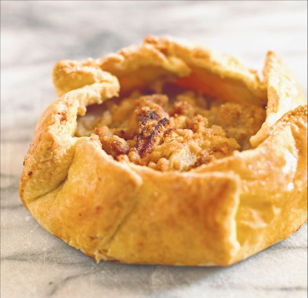 - Τοποθετείτε τα φύλλα σφολιάτας σε δύο στρογγυλά ταψιά για κέικ καλύπτοντας τους πάτους και τα πλαϊνά και κάνετε στα πλαϊνά πτυχώσεις για να γίνουν οι µηλόπιτες όπως στη φωτογραφία. Ρίχνετε στα δυο ταψιά τη γέµιση και από πάνω µοιράζετε θρυµµατισµένο το κραµπλ. Ψήνετε τις πίτες σε προθερµασµένο φούρνο στους 180oC στη µεσαία σχάρα για 35’-40’ µέχρι να ροδίσουν.