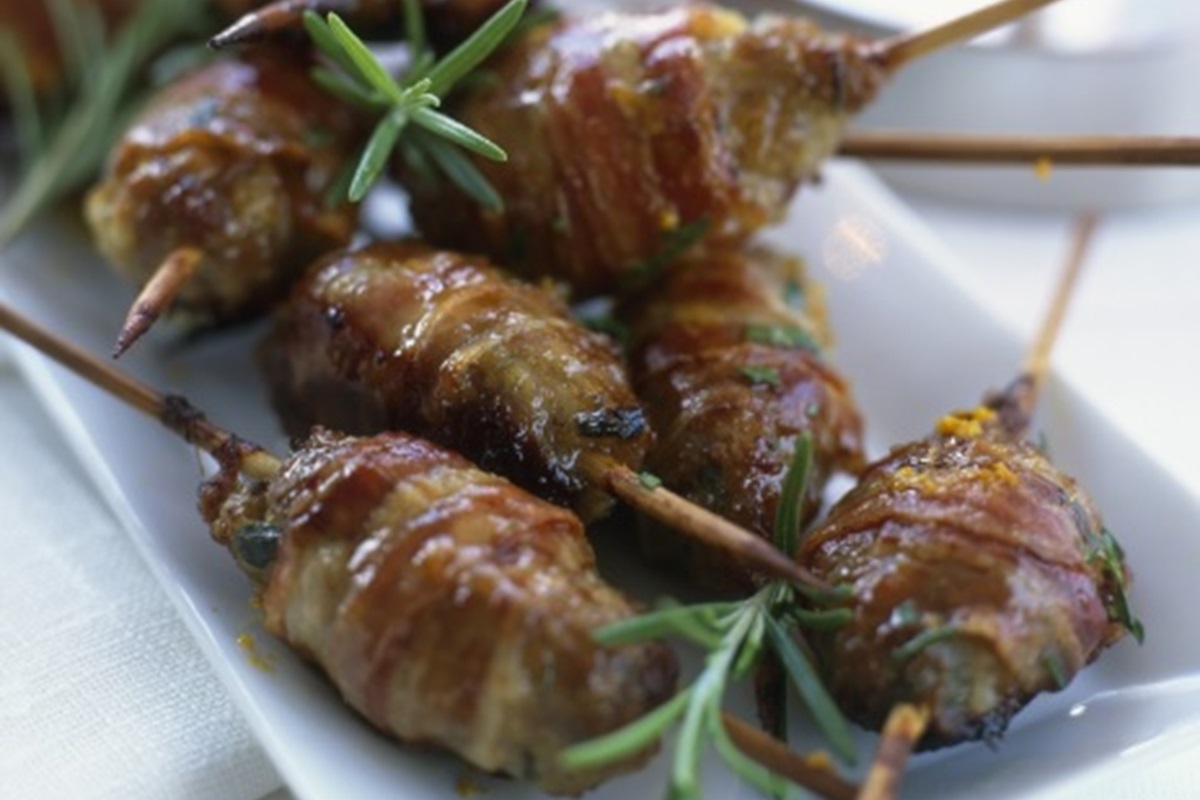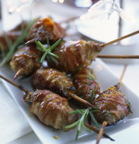 - Τυλίγετε κάθε κεμπάπ με μπέικον και το περνάτε σε μεταλλικά ή ξύλινα σουβλάκια. Ψήνετε στο γκριλ, στην ψηστιέρα ή στα κάρβουνα για 15΄-20΄ γυρίζοντάς τα και από τις δύο πλευρές και προσέχοντας να μην μας αρπάξουν. Τα σερβίρετε αμέσως γαρνίροντας με δεντρολίβανο.