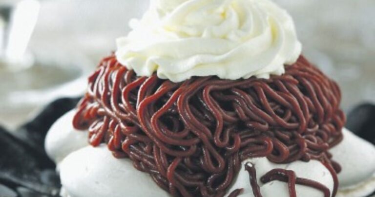 Σε ένα πιάτο τοποθετείτε μερικές μαρέγκες τη μια δίπλα στη άλλη. Βάζετε το κάστανο μέσα σε έναν μύλο του πουρέ και πιέζετε πάνω από τις μαρέγκες, έτσι ώστε να πέσει σα λεπτό σπαγγέτι. Χτυπάτε την υπόλοιπη κρέμα σε σαντιγί και γαρνίρετε πάνω από τον πουρέ κάστανο.