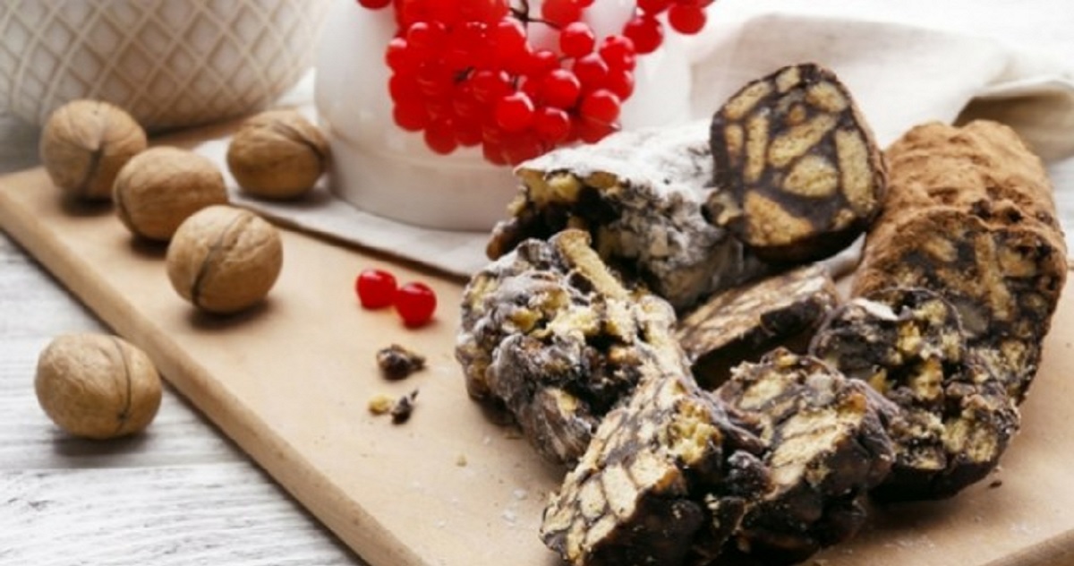- Σε ένα μπολ κομματιάζετε τα μπισκότα και τα ανακατεύετε με τα καρύδια.