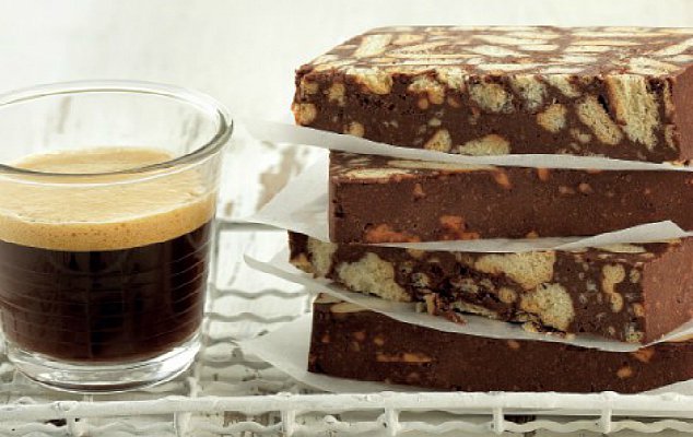 - Σπάμε τα μπισκότα και τα προσθέτουμε στο μείγμα μας. Ανακατεύουμε καλά και στρώνουμε σε μια ορθογώνια (προαιρετικά) φόρμα. Αποθηκεύουμε στην κατάψυξη και μετά από 2 ώρες σερβίρουμε.