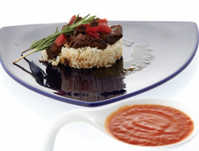 - Σοτάρετε σε κατσαρόλα το κρέας σε δυνατή φωτιά, για 5-7΄, χαμηλώνετε τη φωτιά και ρίχνετε μέσα το κρεμμύδι. Σοτάρετε για άλλα 5΄. Προσθέτετε την πιπεριά, το σκόρδο, το δεντρολίβανο και σοτάρετε άλλα 4΄-5΄.