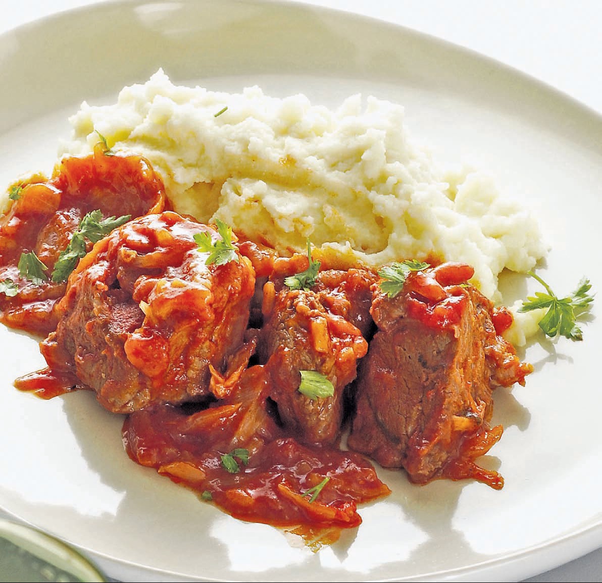 Συνταγή για κοκκινιστό μοσχαράκι με σπιτικό πουρέ