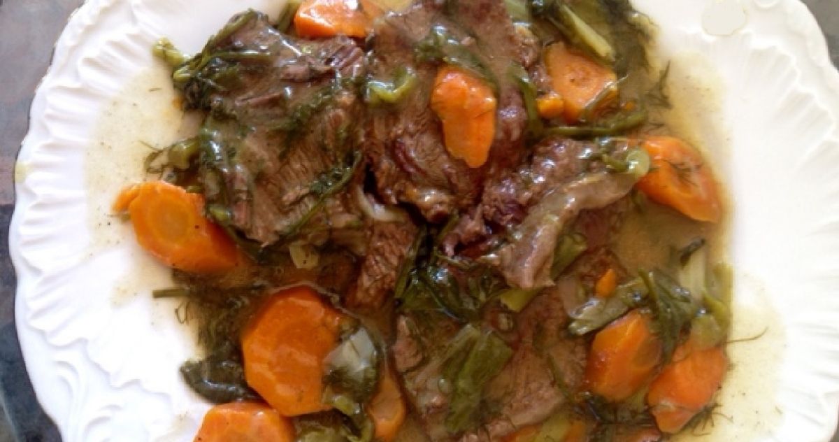 - Όταν το μοσχάρι μαλακώσει αρκετά, ρίχνετε τον άνηθο, τα φρέσκα κρεμμυδάκια ελαφρά ζεματισμένα σε νερό που κοχλάζει, αλάτι και πιπέρι. Μαγειρεύετε το φαγητό για 50' -60' περίπου, σε μέτρια θερμοκρασία, και προσθέτετε νερό αν χρειαστεί.
