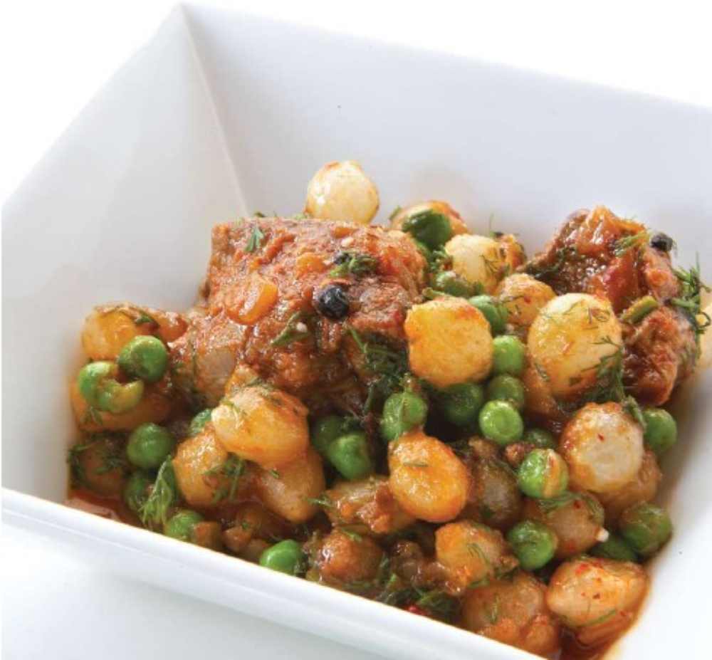 Ένα δυνατό κόκκινο κρασί για ένα εξίσου δυνατό πιάτο. Ένα παλαιωμένο Αγιωργήτικο, με το βαθυκόκκινο ζεστό χρώμα και το χαρμάνι φρούτων και πικάντικων αρωμάτων, ταιριάζει άψογα με τα γλυκά κρεμμυδάκια του στιφάδου και τους τραγανούς κόκκους του αρακά. Ο πλούτος της γεύσης του πιάτου συνδυάζεται άψογα με την πληρότητα που προσφέρει στο στόμα αυτό το κρασί.