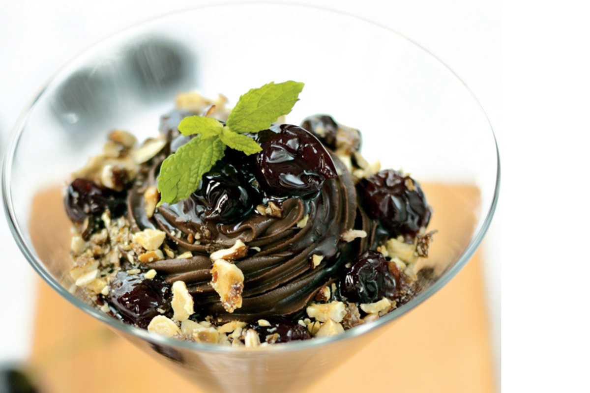 Συνταγή για εκπληκτική μους σοκολάτας με βύσσινα μαριναρισμένα στο κονιάκ της Λίνας Γιατράς. Πρώτη δημοσίευση Εφημερίδα ICookGreek T.05