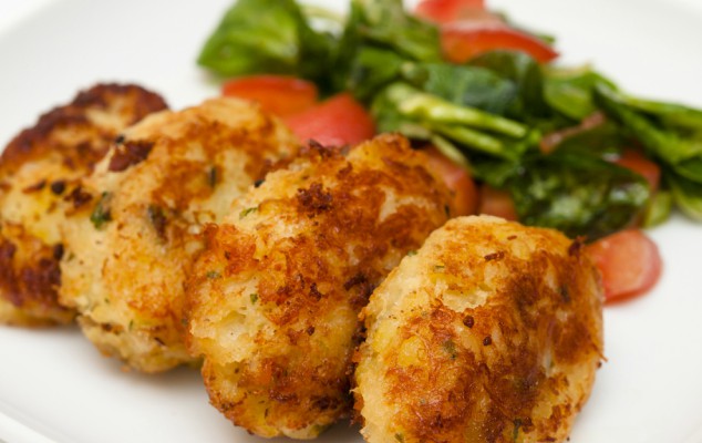 - Ζυμώνετε το μείγμα και το πλάθετε σε δέκα-δώδεκα κροκέτες. Τις περνάτε από τριμμένη φρυγανιά. Τις αφήνετε στο ψυγείο να κρυώσουν κάπως.