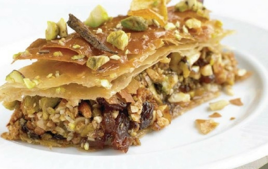- Ανακατεύετε σε μεγάλο μπολ όλα τα υλικά της γέμισης, καρύδια, αμύγδαλα ή φιστίκια, ξερά φρούτα, φρουί γλασέ, ινδική καρύδα, ζάχαρη, κανέλα, γαρίφαλο και το ξύσμα του πορτοκαλιού. Σε καλά βουτυρωμένο ταψί στρώνετε 3-4 φύλλα αλείφοντας ανάμεσά τους βούτυρο, ρίχνετε λίγη γέμιση μετά πάλι 2 φύλλα βουτυρωμένα, πάλι γέμιση και επαναλαμβάνετε τη διαδικασία μέχρι να τελειώσει το υλικό της γέμισης και τα φύλλα. Τελειώνετε με 3 φύλλα επίσης βουτυρωμένα.