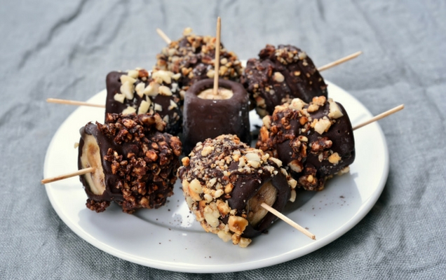 - Ξεφλουδίζετε τις μπανάνες και τις κόβετε στα δύο ή στα τρία. Τις περνάτε στα καλαμάκια, τις σκεπάζετε με μεμβράνη και τις αφήνετε στην κατάψυξη 2-3 ώρες.
