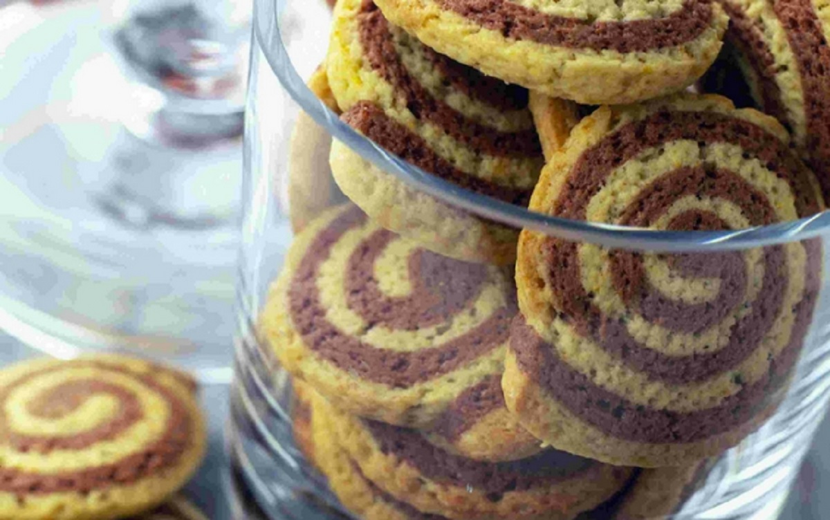 - Χτυπάτε το βούτυρο με τη ζάχαρη μέχρι ν' ασπρίσουν και ν' αφρατέψουν. Προσθέτετε τα 4 αυγά ένα-ένα, τις βανίλιες, το ξύσμα και τέλος το αλεύρι με το μπέικιν. Ζυμώνετε όλα τα υλικά μαζί ώσπου να γίνουν μια ομοιόμορφη και λεία ζύμη. Χωρίζετε τη ζύμη σε 2 ίσες ποσότητες και προσθέτετε στη μία το κακάο. Ξαναζυμώνετε μέχρι να ενσωματωθεί και το κακάο.