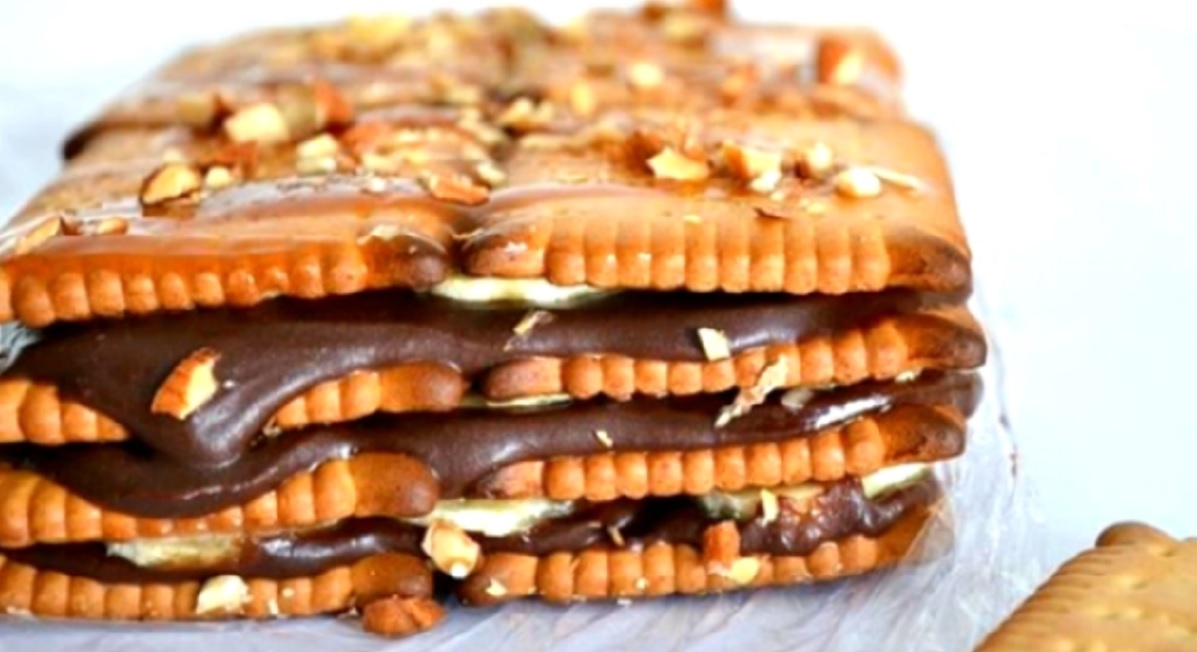 - Σκεπάζετε τη σοκολατένια κρέμα με τα τελευταία μπισκότα, βουτώντας και πάλι κάθε μπισκοτάκι στο γάλα με το μέλι. Αφήνετε το γλυκό στο ψυγείο 1-2 ώρες να κρυώσει. Πασπαλίζετε την επιφάνεια με καρπούς, περιχύνετε με σιρόπι καραμέλας και σερβίρετε.