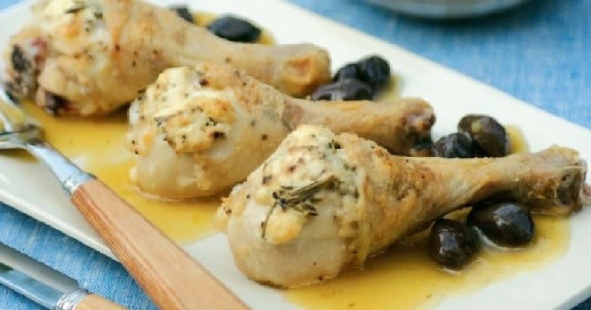 Συνταγή για μπουτάκια κοτόπουλου με φέτα και ελιές. Σερβίρετε με ρύζι πιλάφι ή πατάτες τηγανητές.