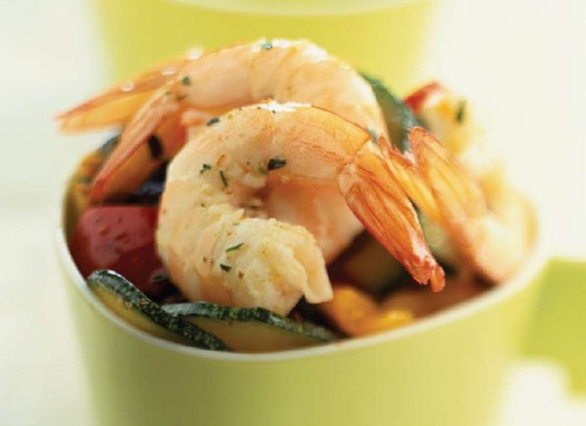 Συνταγή για μαγειρευτό με μελιτζάνες, κολοκυθάκια, πατάτες, φρέσκια ντομάτα και γαρίδες