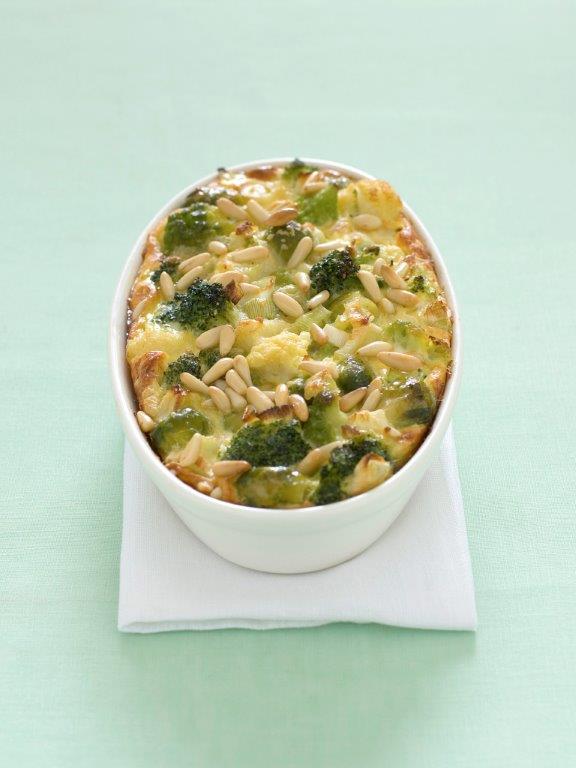 - Βουτυρώνετε μια φόρμα για σουφλέ και την πασπαλίζετε με φρυγανιά. Τοποθετείτε στη φόρμα τα μπουκετάκια του μπρόκολου. Ρίχνετε πάνω το μείγμα της μπεσαμέλ και πασπαλίζετε την επιφάνεια με το κουκουνάρι και το υπόλοιπο τυρί. Ψήνετε σε προθερμασμένο φούρνο 20΄-25΄ στους 180ο C, μέχρις ότου το φαγητό φουσκώσει και ροδίσει. Σερβίρετε αμέσως.