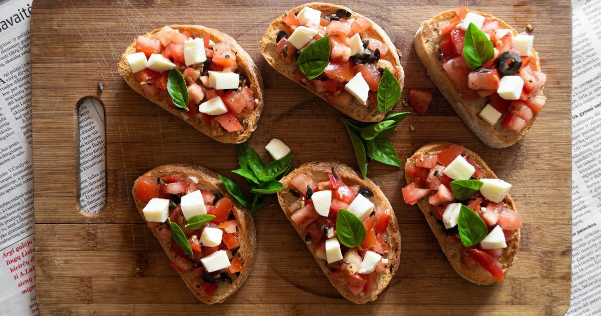 Συνταγή για φρυγανισμένο ψωμί με κοτόπουλο, ελιές και πιπεριές. Με μπρουσκέτες μπορεί να συνοδέψει κανείς ευχάριστα το κρασί του.