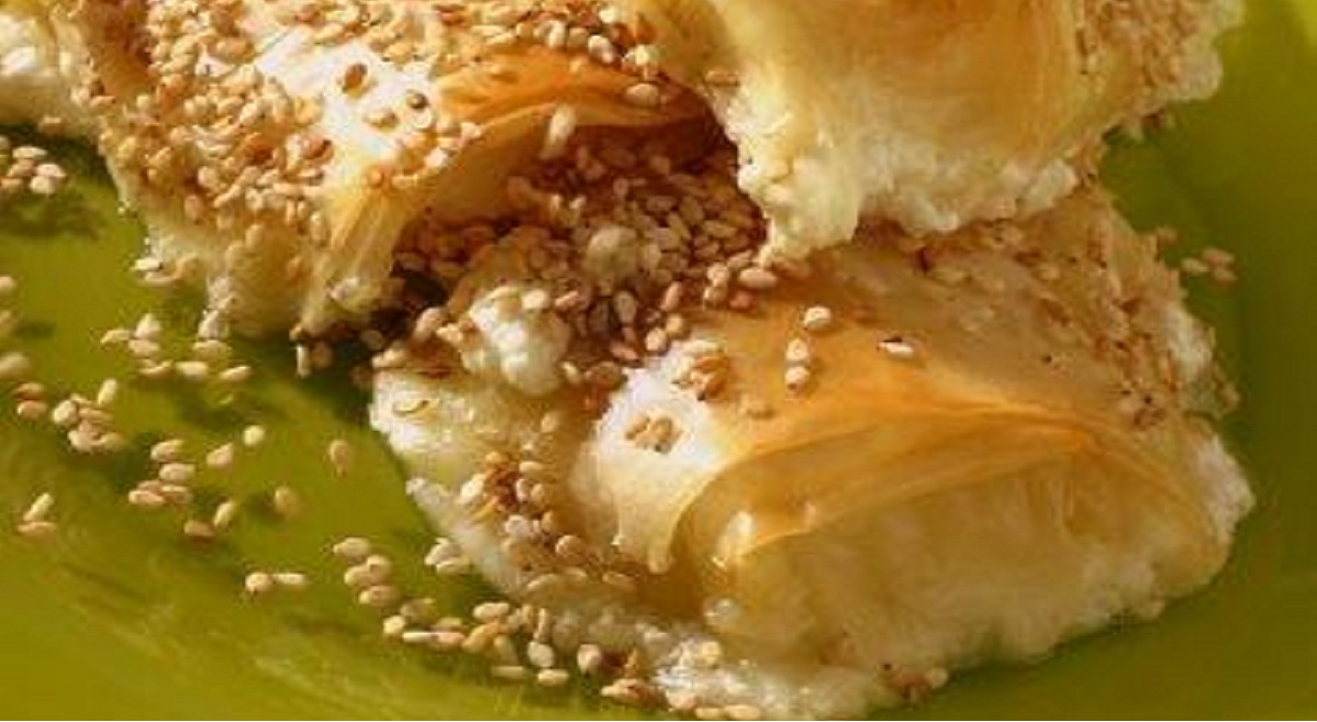 - Μοιράζετε το μείγμα της γέμισης στις λωρίδες του φύλλου και τις τυλίγετε σε ρολά. Τοποθετείτε τα ρολά σε ένα ταψί ελαφρά βουτυρωμένο και τα αλείφετε κι αυτά με βούτυρο. Τα πασπαλίζετε με σουσάμι.
