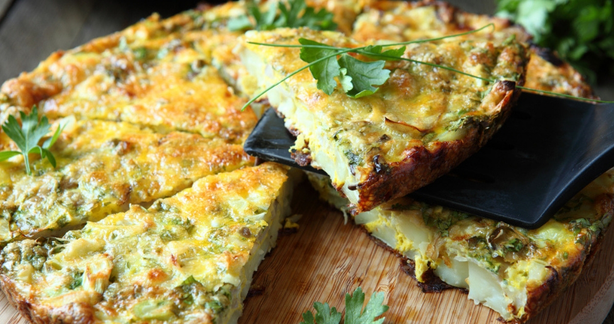- Χτυπάτε την κρέμα γάλακτος ή το εβαπορέ με τα αυγά, αλατοπίπερο και το μαϊντανό. Περιχύνετε με το μείγμα το περιεχόμενο του ταψιού και αφήνετε να σταθεί 15'-20'. Ψήνετε την ομελέτα στο φούρνο στους 180° - 200° C στον αέρα 40'-45'.