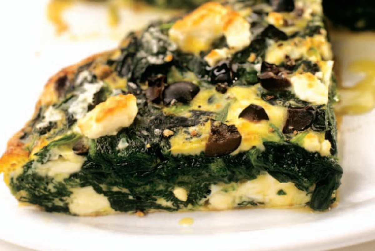 Συνταγή για χορταστική ομελέτα με σπανάκι, ελιές και τυριά ανάμεικτα.
