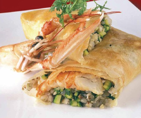 - Σοτάρετε όλα τα λαχανικά σε 3-4 κουταλιές της σούπας ελαιόλαδο για 5’-7’, προσθέτετε τις γαρίδες και την καραβιδόψιχα χοντροκομμένες και αλατοπιπερώνετε. Κατεβάζετε από τη φωτιά όταν τα υγρά εξατμιστούν εντελώς και προσθέτετε στο μείγμα ένα ασπράδι χτυπημένο και το μαϊντανό. Ανακατεύετε καλά.