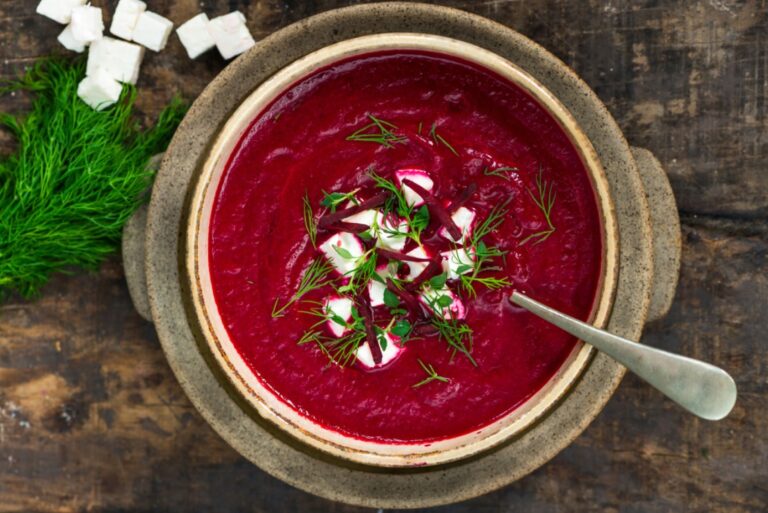 - Προσθέτετε το γιαούρτι στο φιλτραρισμένο υγρό. Ρίχνετε και τα φρέσκα κρεμμυδάκια, τον άνηθο, το χυμό λεμονιού και άσπρο πιπέρι και ανακατεύετε καλά. Όταν τη σερβίρετε γαρνίρετε με λίγο τριμμένο παντζάρι, αν θέλετε, και μοιράζετε σε κάθε πιάτο λίγα κυβάκια φέτας.