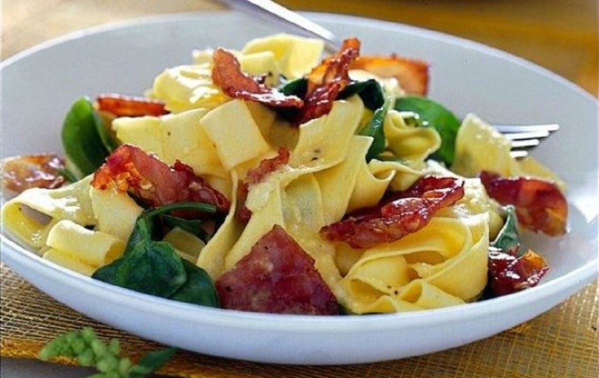 Συνταγή για παπαρδέλες με μπέικον και αυγά