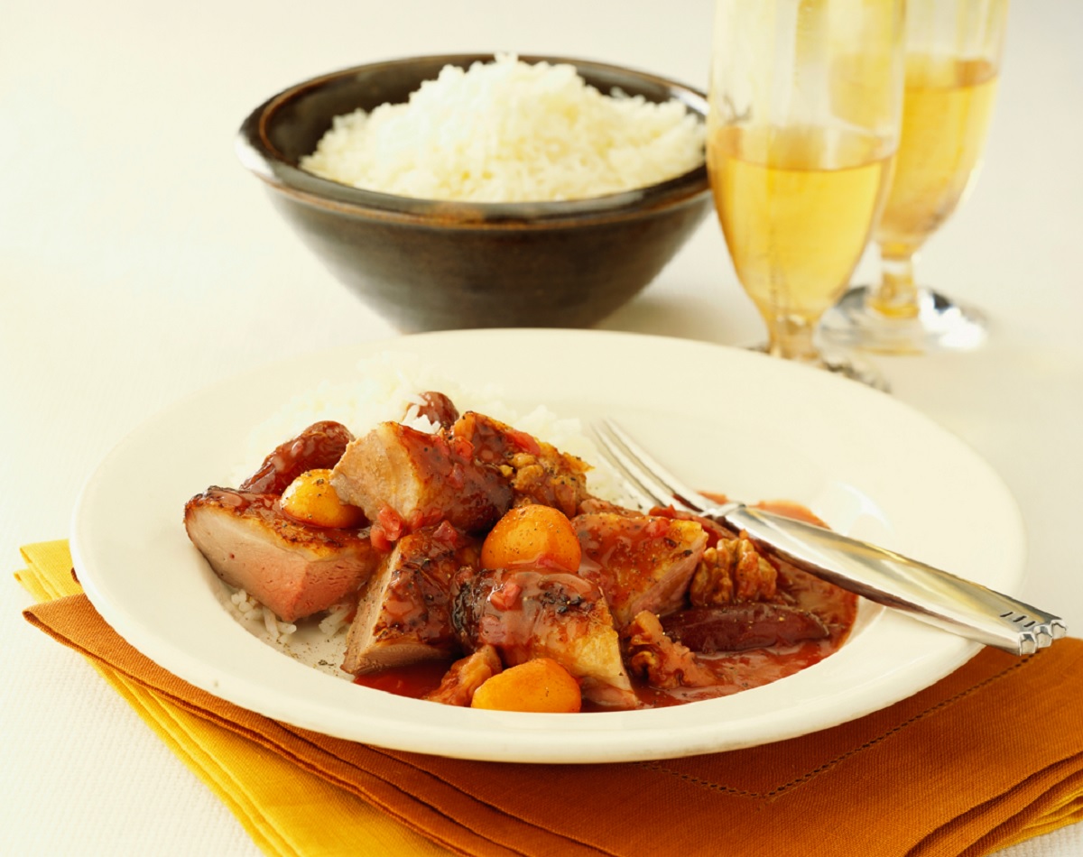 - Βάζετε την πάπια και τα κουμκουάτ σε αντικολλητικό τηγάνι και περιχύνετε με τη μαρινάτα. Βράζετε μέσα στη μαρινάτα για 4’ και σερβίρετε αμέσως με ρύζι μπασμάτι.