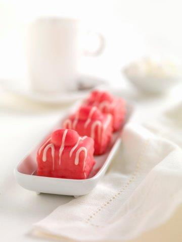 - Κόβετε το γλυκό σε μικρά τετράγωνα παστάκια και τα περιχύνετε με το κόκκινο γλάσο. Αφήνετε τα παστάκια στο ψυγείο μέχρι τη στιγμή που θα τα σερβίρετε.