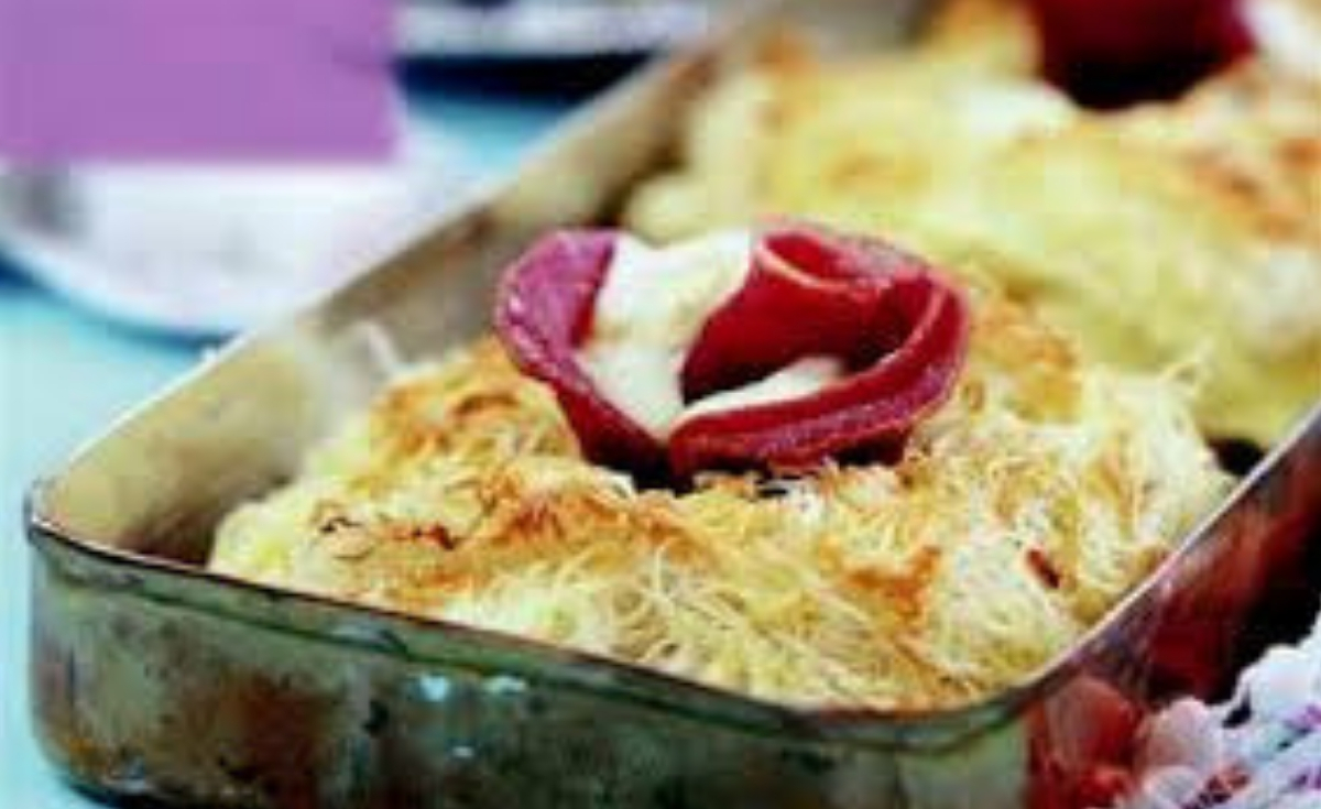 - Αλείφετε με λίγο βούτυρο ένα πυρίμαχο σκεύος. Ανοίγετε με τα δάχτυλα το φύλλο καταΐφι (το ξαίνετε) μέχρι να απλωθεί καλά και τοποθετείτε το μισό από αυτό στο πυρέξ.