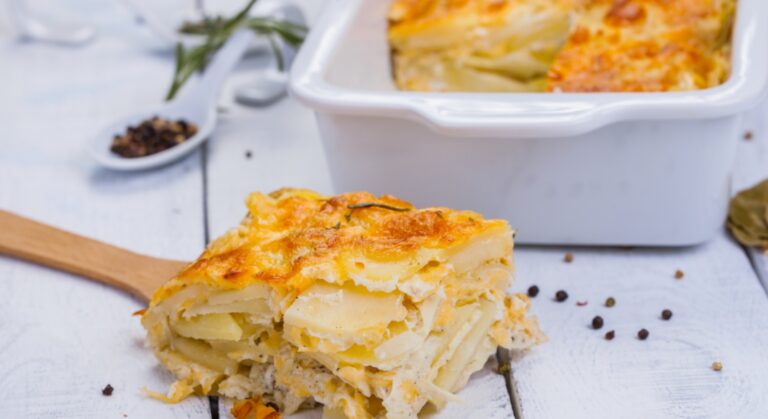 - Καθαρίζετε, πλένετε και κόβετε σε λεπτές φέτες τις πατάτες. Τρίβετε με σκόρδο ένα πυρίμαχο σκεύος και τοποθετείτε μέσα τις πατάτες σε στρώσεις, πασπαλίζοντας ενδιάμεσα με αλατοπίπερο, μοσχοκάρυδο και τριμμένο κίτρινο τυρί.