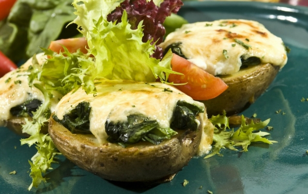 - Σε ένα μπολ αναμειγνύετε το σπανάκι με το κασέρι και τη μισή κεφαλογραβιέρα, αλατοπιπερώνετε και γεμίζετε με το μείγμα τις πατάτες. Από πάνω σκορπίζετε την υπόλοιπη κεφαλογραβιέρα. Βάζετε πάνω στην κάθε πατάτα ένα κομματάκι βούτυρο και ψήνετε στο φούρνο μέχρι να λιώσει το τυρί.