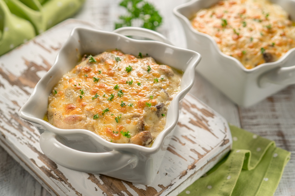 Συνταγή για πατάτες ογκρατέν με μανιτάρια και κοτόπουλο. Σερβίρεται ως ορεκτικό, αλλά μετατρέπεται και σε κυρίως πιάτο μαζί με φρεσκοκομμένη πράσινη σαλάτα.
