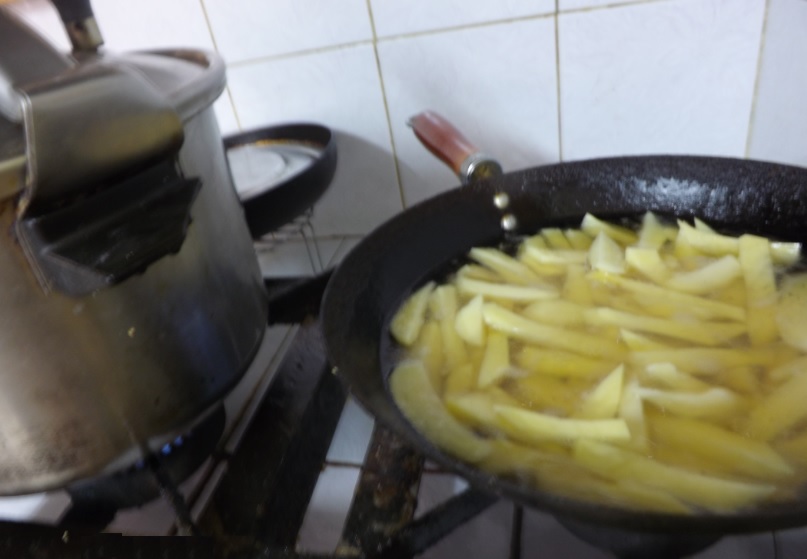 - Πλένετε και ξεφλουδίζετε τις πατάτες.Τις κόβετε σε μικρές λωρίδες πάχους 1 εκ. Τις τοποθετείτε σε μία λεκάνη με νερό. Στη συνέχεια τις στραγγίζετε καλά.