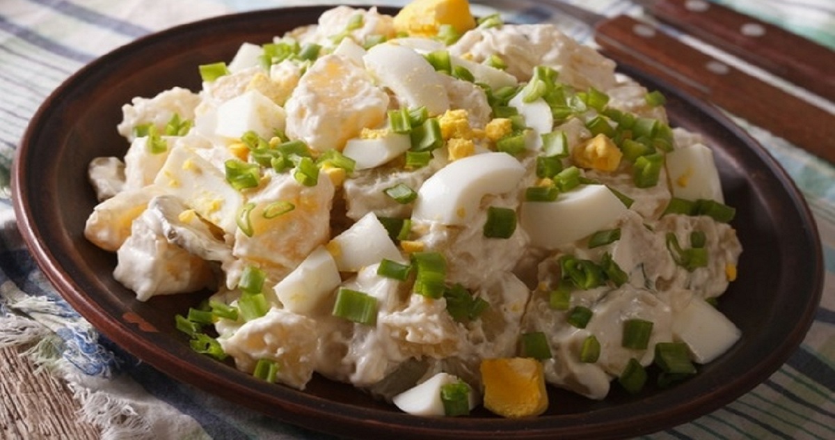 - Στραγγίζετε τις πατάτες, τις ρίχνετε κι αυτές στο μπολ, προσθέτετε τα αυγά, το κρεμμυδάκι και τον άνηθο και ανακατεύετε καλά να πάει παντού η σάλτσα. Σερβίρετε.