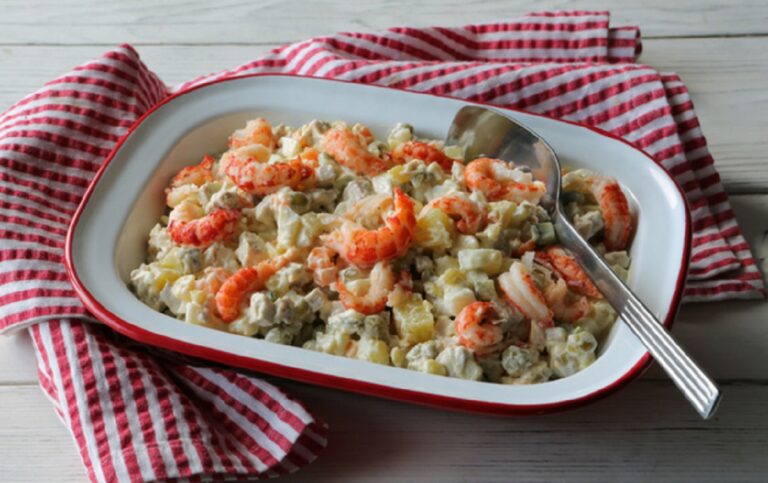 Συνταγή για πατατοσαλάτα με γαριδούλες και αρακά