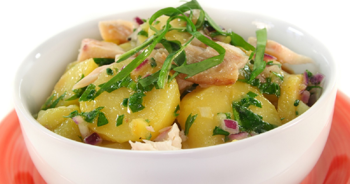 - Καθαρίζετε τις πατάτες και τις κόβετε σε ροδέλες. Τις βράζετε σε μπόλικο αλατισμένο νερό και τις στραγγίζετε καλά. Μόλις κρυώσουν τις σερβίρετε σε πιατέλα και προσθέτετε την πέστροφα, το κρεμμύδι, το αγγουράκι τουρσί ψιλοκομμένο και τα φρέσκα μυρωδικά.