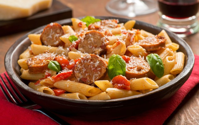- Σρβίρετε τα μακαρόνια με τα λουκανικά και πασπαλίζετε προαιρετικά με τριμμένο τυρί και λίγο βασιλικό.