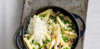 Συνταγή για πένες με αρακά, μπέικον και κρέμα γάλακτος