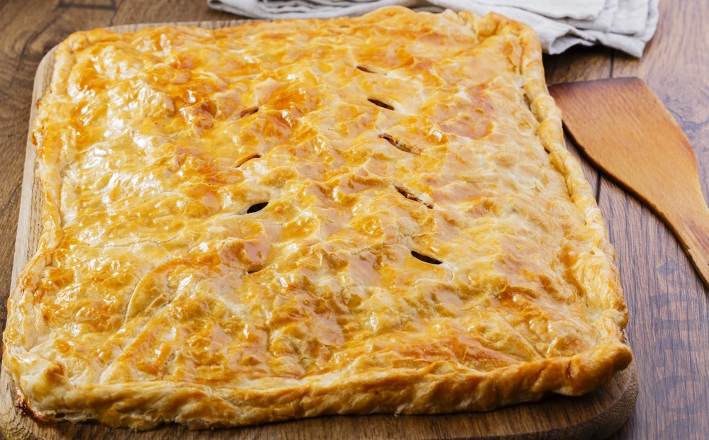 - Σε λαδωμένο ταψί απλώνετε το ένα φύλλο, αδειάζετε τη γέμιση και καλύπτετε με το δεύτερο φύλλο. Χτυπάτε 1 αυγό με 1 κουταλιά σούπας ελαιόλαδο και 2 κουταλιές σούπας νερό και αλείφετε την πίτα. Τρυπάτε το φύλλο και ψήνετε στους 180°C αέρα για 1 ώρα περίπου ή μέχρι να ροδίσει.
