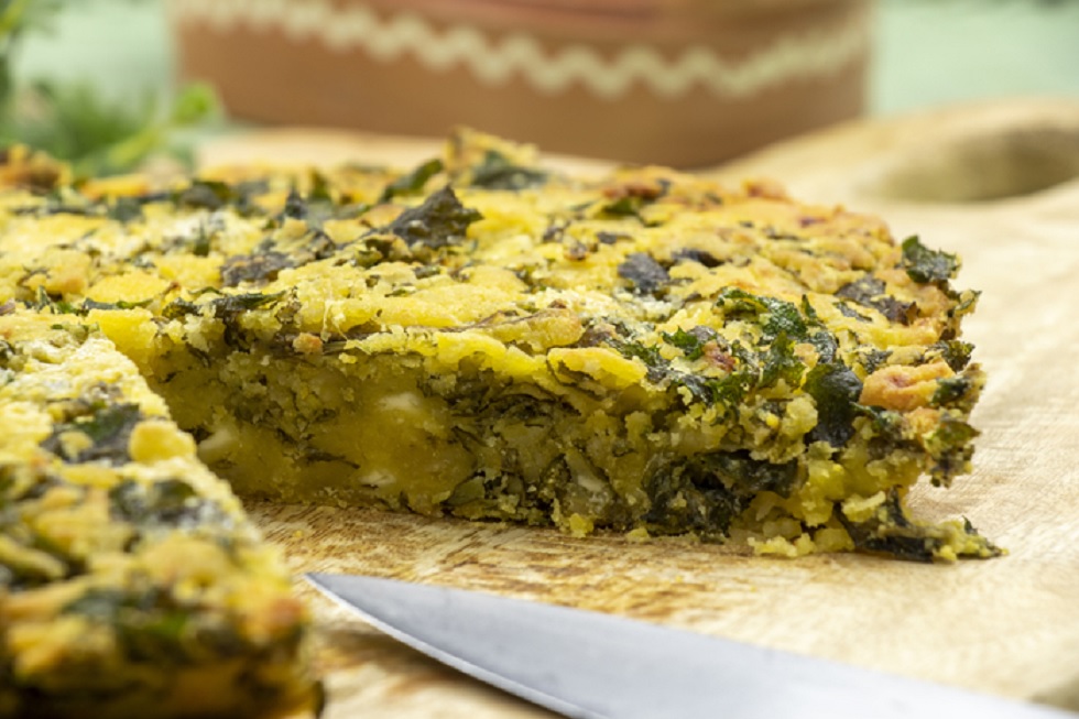Παραδοσιακή μακεδονίτικη πίτα πισπιλίτα με καλαμποκάλευρο, χόρτα, φέτα και τραχανά.