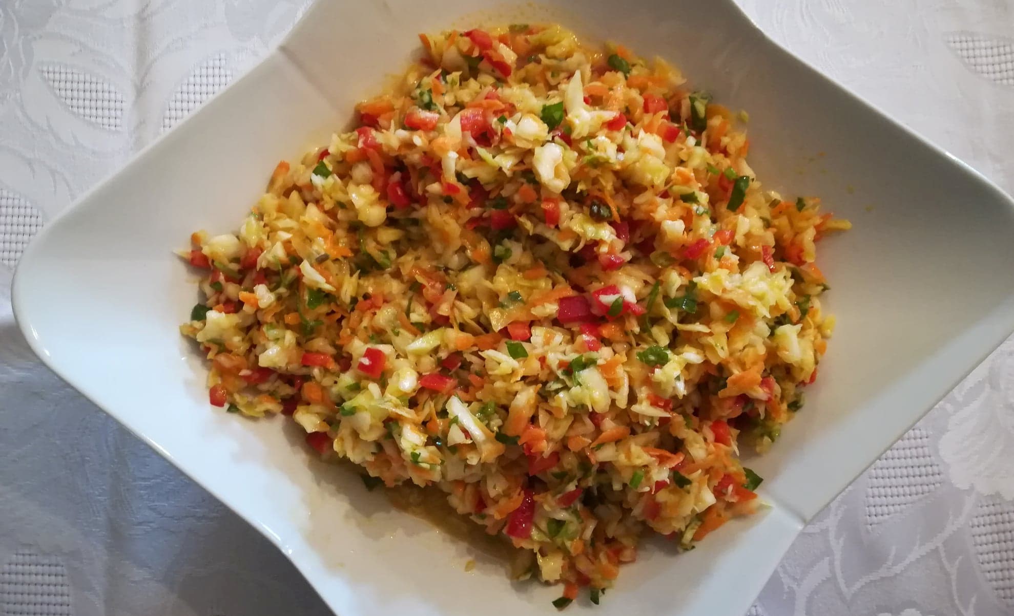 - Ρίχνετε σε μπολ τα ψιλοκομμένα λαχανικά, τα αλατίζετε καλά και τα περιχύνετε με το χυμό του λεμονιού.