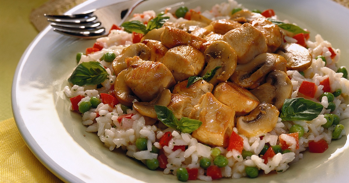 Συνταγή για τηγανιά με χοιρινό και μανιτάρια συνοδευμένη από ρύζι με λαχανικά